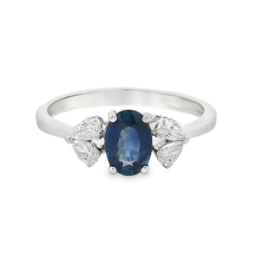 This exquisite 18ct white gold ring features a captivating 1.10ct oval-cut sapphire, radiating a rich and timeless blue. On either side, delicate clusters of pear-shaped diamonds, totalling 0.29ct, add exceptional sparkle and enhance the elegance of the central stone. The sleek white gold band provides a refined, modern finish, creating a beautifully balanced design. Perfect for special occasions or everyday luxury, this piece offers classic sophistication with a touch of contemporary brilliance.