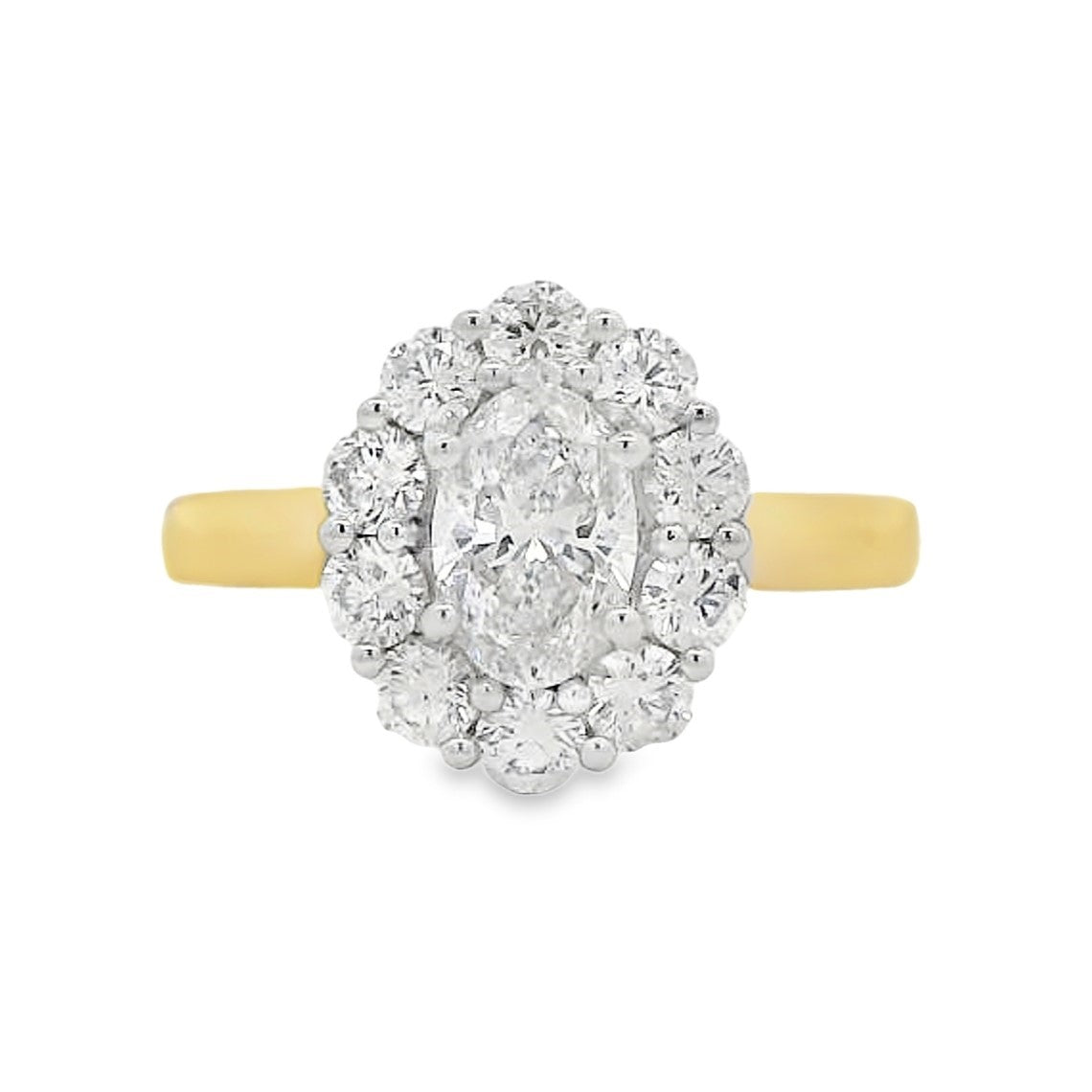 This 18ct yellow gold engagement ring showcases a magnificent 0.52ct oval cut diamond graded D colour and VS1 clarity by GIA, positioned at the centre of an elegant halo setting. Complemented by 0.45ct of surrounding diamonds, the design amplifies brilliance whilst the elongated oval silhouette delivers contemporary sophistication. The combination of premium stone quality, expert craftsmanship, and refined proportions creates a distinctive piece that commands attention without compromise. An exceptional choice for those seeking a modern interpretation of timeless elegance.