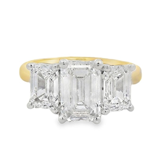2.06ct Three Stone Emerald Cut Lab Grown Diamond Ring in 18ct Yellow Gold