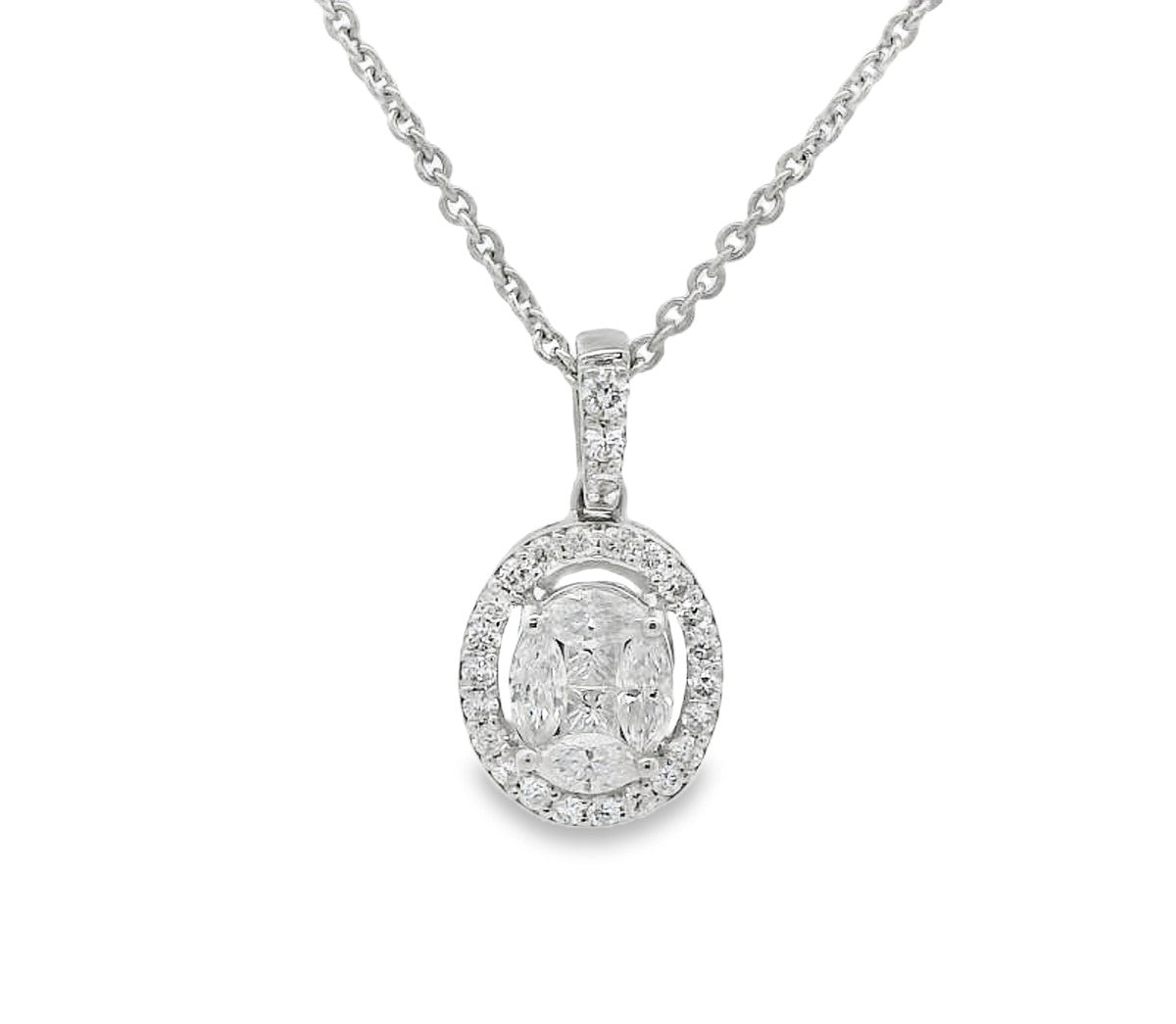 This delicate 18ct white gold pendant features 0.40ct of natural diamonds arranged in a beautifully crafted oval design. At the centre, marquise and round diamonds create a sparkling focal cluster, enhanced by a halo of meticulously set brilliant-cut stones for added radiance. The diamond-set bail provides an additional touch of sophistication, allowing the pendant to catch the light from every angle. Suspended from a refined white gold chain, this piece offers timeless elegance and effortless everyday luxury.