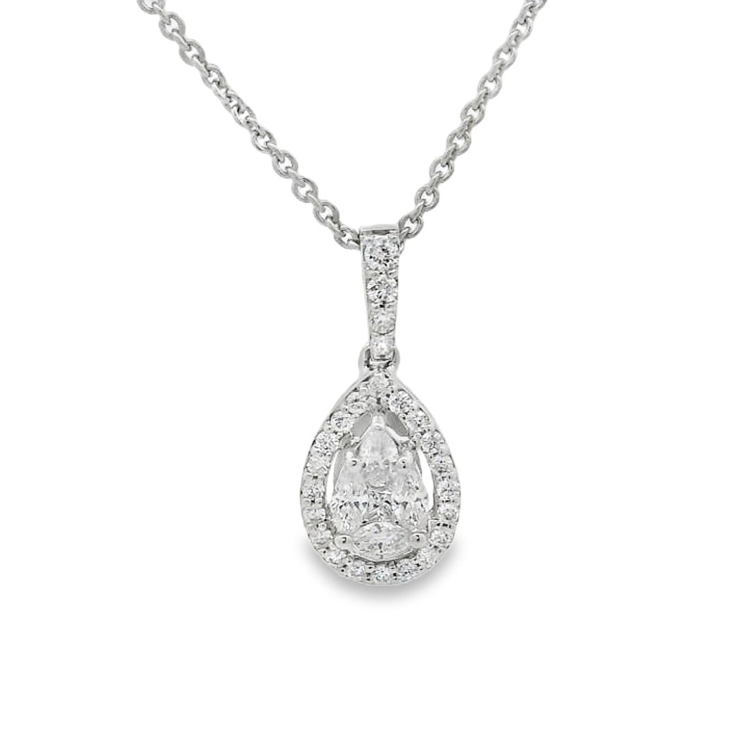This refined 18ct white gold pendant showcases 0.30ct of natural diamonds in a graceful pear-shaped design. At its centre, a delicate cluster of marquise and brilliant-cut diamonds creates a sparkling focal point, beautifully framed by a shimmering halo for added radiance. The diamond-set bail enhances the pendant’s elegance, allowing it to catch the light with every movement. Suspended from a fine white gold chain, this piece offers timeless sophistication and understated luxury, perfect for both everyday wear and special occasions.