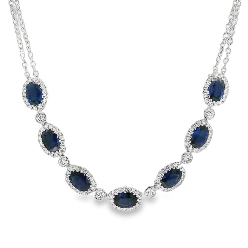 This stunning necklace showcases vibrant sapphires totalling 3.57ct, each elegantly framed by sparkling diamonds totalling 0.94ct. Crafted in luxurious 18ct white gold, the design features a graceful arrangement of oval sapphires linked with brilliant diamond accents, creating a beautifully balanced flow of colour and light. The refined split chain adds both comfort and sophistication, making this an exceptional statement piece perfect for any special occasion or refined jewellery collection.
