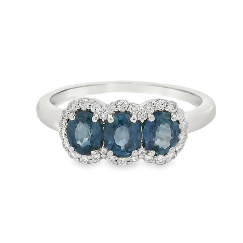 This elegant 18ct white gold ring showcases three natural oval-cut sapphires with a combined weight of 1.50ct, radiating a deep, captivating blue. Each sapphire is beautifully framed by a shimmering halo of round brilliant diamonds, totalling 0.20ct, adding refined sparkle and enhancing the richness of the gemstones. The sleek white gold band provides a modern, luxurious finish, making this piece a timeless choice for those who love classic sophistication with a vibrant touch of colour.
